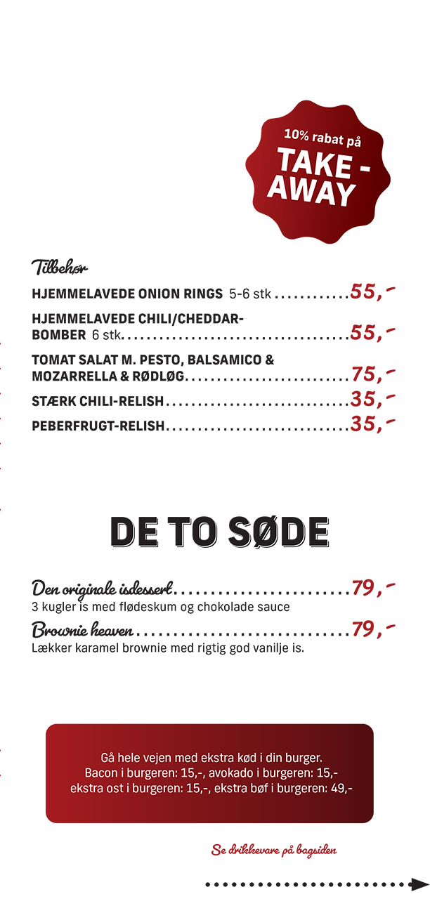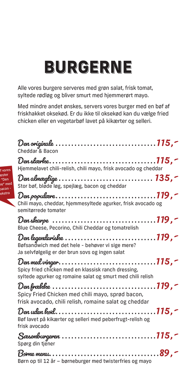 Vi har samlet restaurant og bar under samme tag. Så uanset om I har lyst til en lækker burger, gode cocktails, kolde øl eller måske alle tre ting – så har vi rammerne til at skabe en hyggelig aften for jer.